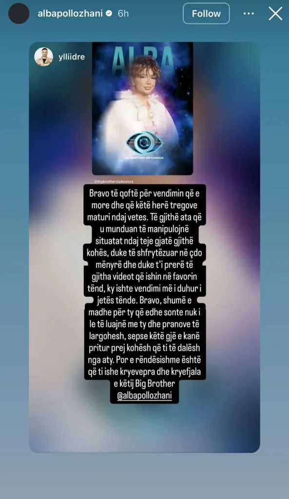 Pas daljes nga Big Brother VIP Kosova, Alba ka reaguar përmes rrjeteve sociale, duke shpërndarë një postim mbështetës nga Yll Dreshaj, ish-banor i “Ferma VIP”.