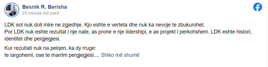 “LDK sot nuk doli mire ne zgjedhje. Kjo eshte e verteta dhe nuk ka nevoje te zbukurohet. Por LDK nuk eshte rezultat i nje nate, as prone e nje lidershipi, e as projekt i perkohshem. LDK eshte histori, identitet dhe pergjegjesi. Kur rezultati nuk na pelqen, ka dy rruge: te largohemi, ose te marrim pergjegjesi. Une besoj te e dyta. Ka shprese, sepse LDK ka njerez, mendje dhe energji qe ende nuk jane aktivizuar. Ka shprese, sepse kjo parti di te ringrihet vetem kur flet hapur me veten dhe me qytetaret. Dhe ka shprese, sepse ndryshimi nuk vjen nga heshtja, por nga guximi per ta marre timonin”, ka shkruar ai, duke shtuar se kjo parti ka nevojë për drejtim të ri.