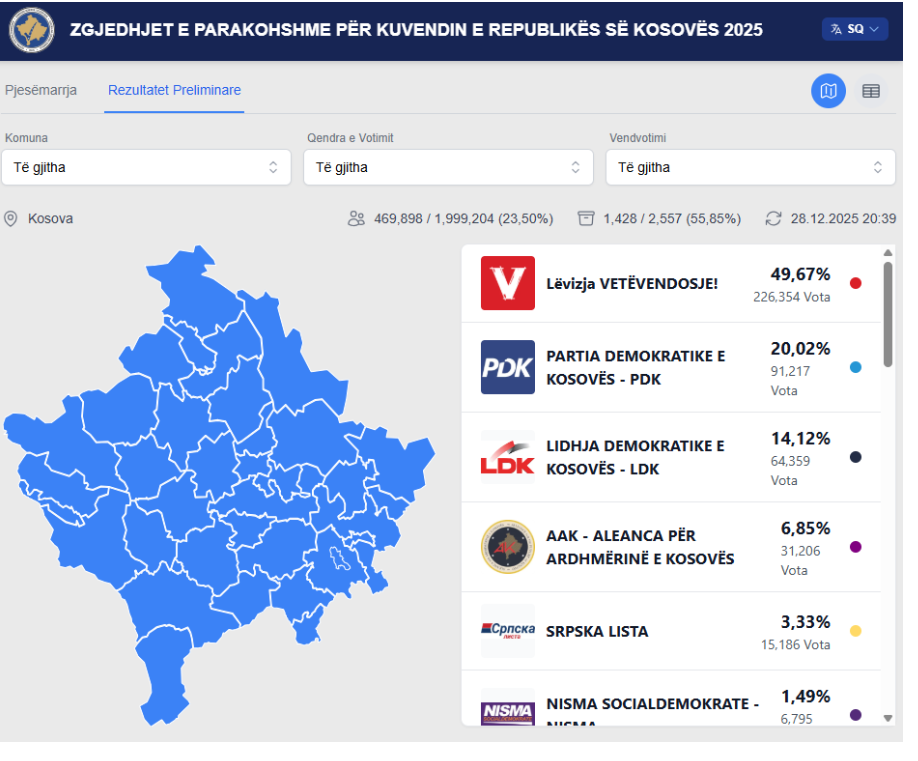 Me mbi gjysmën e votave të numëruara Vetëvendosje është në 49.6%.