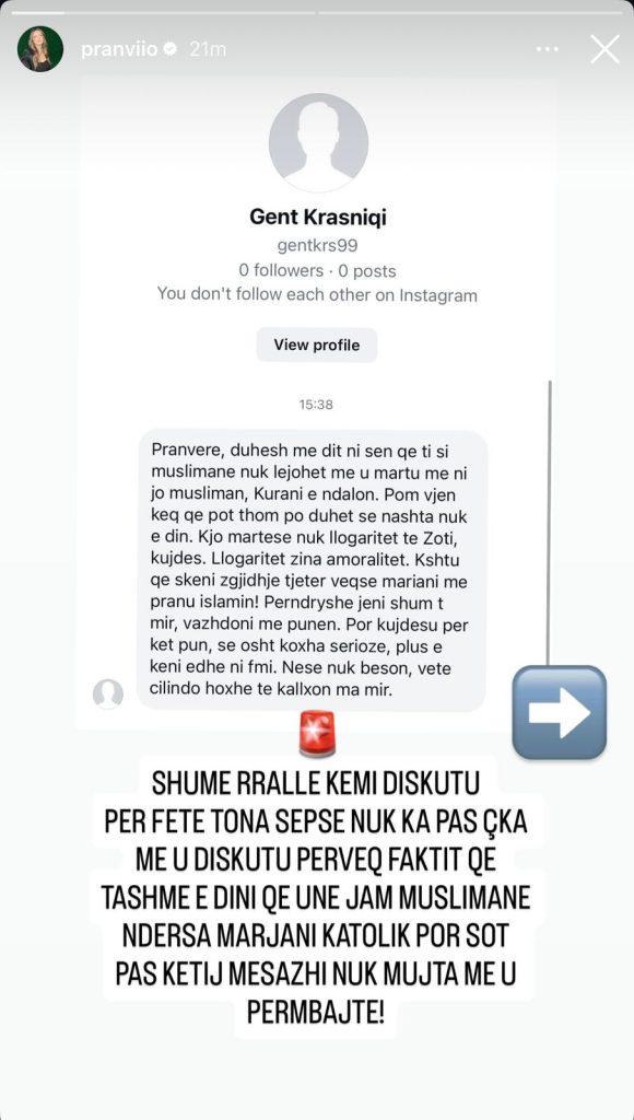 Përmes disa postimeve në Instastory, ajo ka publikuar një mesazh privat nga një ndjekës, i cili i “tërhiqte vërejtjen” se si myslimane nuk i lejohej martesa me një person të një feje tjetër, duke e cilësuar lidhjen e tyre si “imoralitet”.