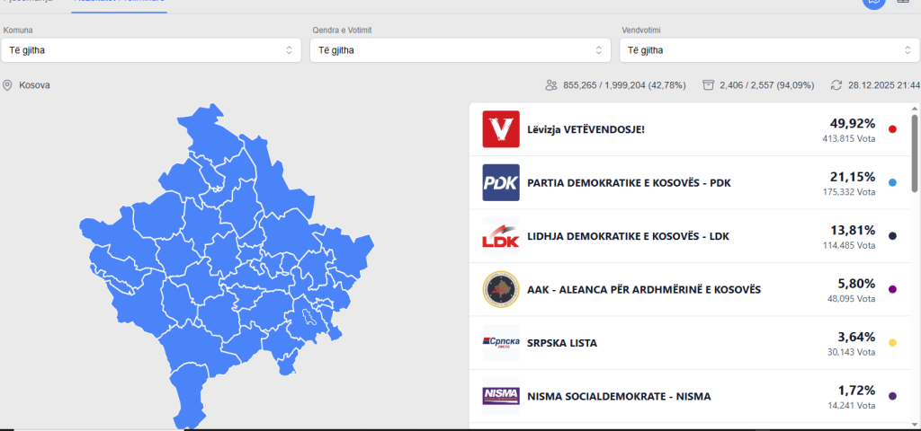 Numërohen rreth 95% të votave, Vetëvendosje bie nën 50 %