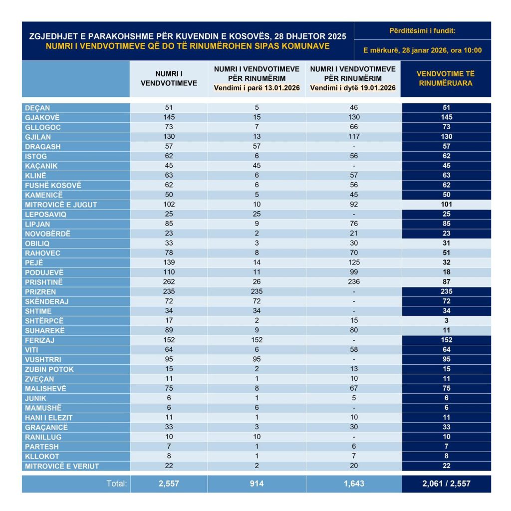 Nga fillimi i këtij procesi (e martë, 13 janar 2026, ora 18:00) dhe deri më tani (e mërkurë, 28 janar 2026, ora 10:00) janë rinumëruar mbi 80% apo 2,061 nga 2,557 vendvotime.