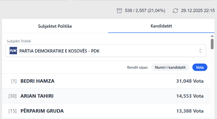 Me 538 nga 2,557 vendvotime të procesuara deri në orën 22:15 të datës 29 dhjetor 2025, kandidati i Partisë Demokratike të Kosovës (PDK), Arian Tahiri, ka siguruar 14,553 vota, duke u renditur i dyti më i votuari në listën e kësaj partie, menjëherë pas kandidatit për kryeministër Bedri Hamza.